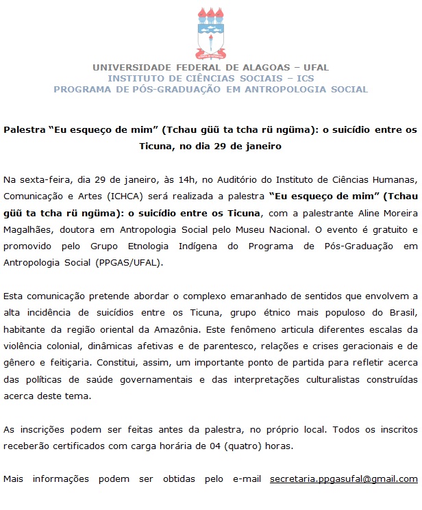 Na sexta-feira, dia 29 de janeiro, às 14h, no Auditório do Instituto de Ciências Humanas, Comunicação e Artes (ICHCA) será realizada a palestra “Eu esqueço de mim” (Tchau güũ ta tcha rü ngüma): o suicídio entre os Ticuna, com a palestrante Aline Moreira Magalhães, doutora em Antropologia Social pelo Museu Nacional. O evento é gratuito e promovido pelo Grupo Etnologia Indígena do Programa de Pós-Graduação em Antropologia Social (PPGAS/UFAL).